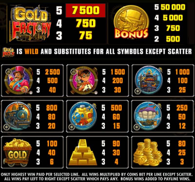 Gold Factory has a base game jackpot of 50,000 coins based on a one coin per line spin, so when playing more than one coin per line on this Gold Factory slot the jackpot can be increased.